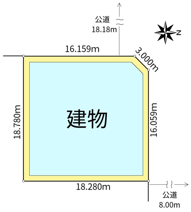 接道状況 二方角地 北側8.0m公道に16.0m接道 西側18.18m公道に16.0m接道 北東側スミキリに3.00m接道 現況 賃貸中 満室想定利回り7.66% 年間想定収益額420万円