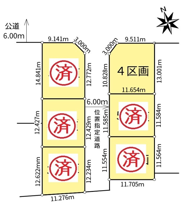 接道状況 | 4号棟:北東側6.0m公道に9.51m、北西側6.00m位置指定道路に10.82m、北側スミキリ3.00m接道 | 現況 | 更地 |
