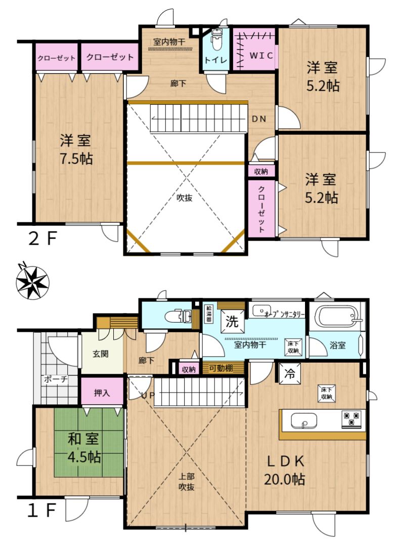 築年月 | 2025(令和7)年7月 | 間取内容 | 1号棟:1F LDK20.0帖 和4.5帖 2F洋7.5帖 洋5.2帖 洋5.2帖 |